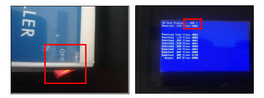 2、將電控柜的電源開(kāi)關(guān)撥動(dòng)“ON”處,確保觸摸屏正常上電。上電后,觸摸屏?xí)詣?dòng)更新畫面,耐心等待1分鐘左右,待觸摸屏上方顯示“END”字樣后,代表下載畫面完成。如下圖所示: